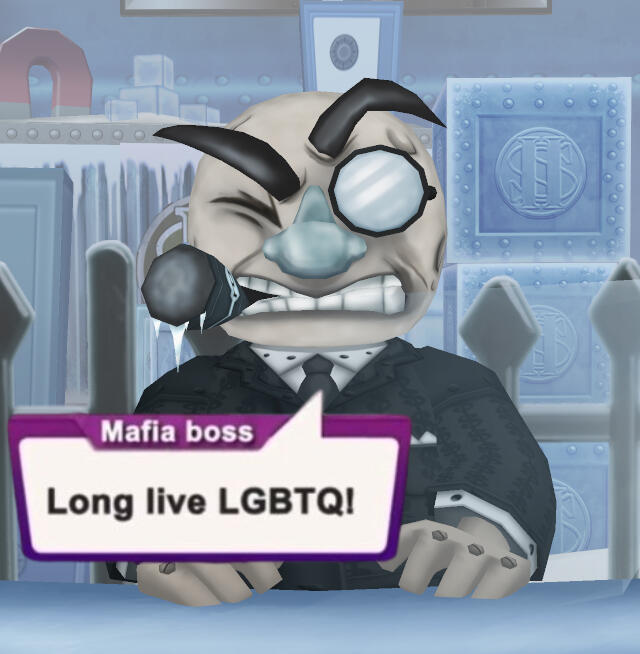 And can't forget the theming! It's such an interesting mixture, them going with mafia, snow/ice, and space. I know the last one usually gets shoved aside to the dialogue and their names, but I think it's something that the fight would feel incomplete without. Like IDK stuff like one of the Slush Fund lines referring to the other Cogs as "neutron stars" just always gets a smile out of me! The dialogue is clearly made with care, and I'm very grateful for that!!